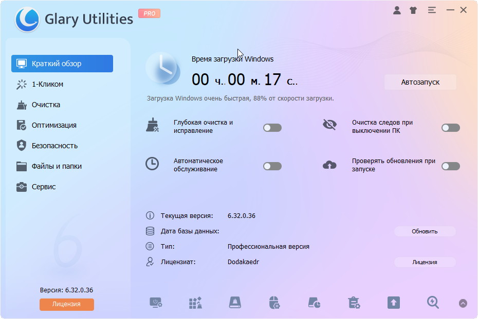 ![]() Операционная система Windows устроена так, что после некоторого времени эксплуатации, она имеет свойство собирать в себе мусорные файлы, которые в конце концов будут отягощать её работу. Это будет выливаться в зависания, медленный отклик, и другие не приятные вещи. Что бы этого не произошло, её достаточно периодически подчищать, для этого можно использовать Glary Utilities. Это комплексное решение для правильной очистки и оптимизации всей системы компьютера. Программа поможет Вам отыскать на дисках те файлы которые просто занимают место, когда-то они нужны были системе, но теперь нет. Так вот, Вы сможете их быстро и безопасно стереть, не боясь никаких последствий, это поможет Вам получить больше свободного места. Так же Вы сможете произвести дефрагментацию дисков, после которой увеличивается отклик файлов. Более того, можно проверить их и на существующие ошибки. Ещё можно попытаться найти абсолютно одинаковые файлы, такое тоже часто бывает, что в компьютере хранятся одни и тежи данные под разными именами. Стоит сказать, что утилита оснащена хорошим деинсталлятором, который поможет удалять программы корректно. В добавок есть инструмент для оптимизации оперативной памяти. Реестр Windows это тоже важный компонент, так вот, его Вы сможете почистить, и конечно же дефрагментировать, и на всякий случай сделать его резервную копию. Ещё можно удалять всю историю пользованием компьютера, надёжно шифровать файлы. Для более быстрой работы можно поковыряться в системных службах, отключить те, которые не нужны, и только зря запущены. Доступно и управление автозагрузкой, там Вы сможете вырубить всё то, что вам не нужно. Ещё сможете отредактировать контекстное меню Windows, получить самую подробную информацию о вашей системе. Имеется инструмент и для работы с драйверами, который позволит удалять их, восстанавливать и создавать резервные копии. Для обеспечения безопасности, создатели встроили специальный модуль, который позволит проверять компьютер на предмет его заражения вирусами. Размер: 16 Mb Язык: русский Лекарство: есть ключ Скачать бесплатно: Glary Utilities 6.32.0.36 Final |
