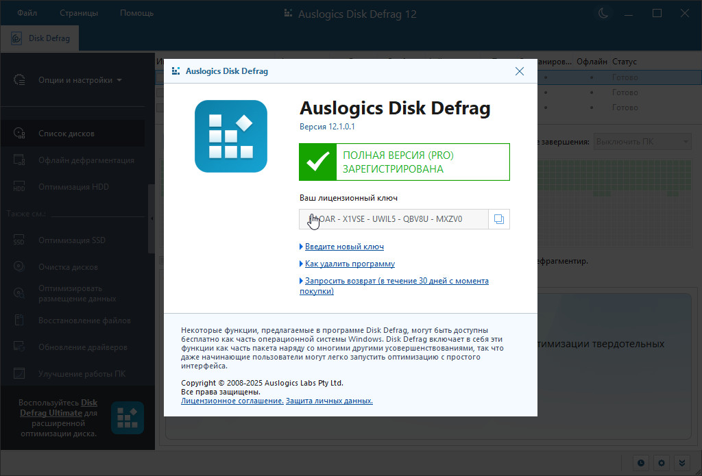 Auslogics Disk Defrag Pro 12.1.0.1 версия с русским языком