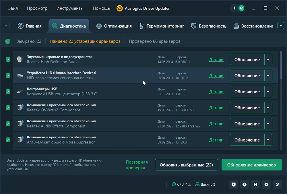 И так, после того как программа отсканирует систему, перед вами будет весь список драйверов, которые можно обновить. Дальше уже решать Вам, что именно обновить, а что оставить без изменений. Вот как-то так, думаю всё предельно ясно, и понятно я вам объяснил.