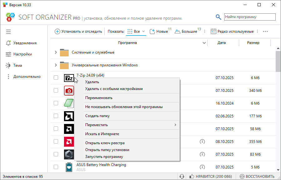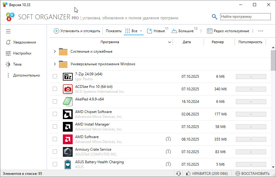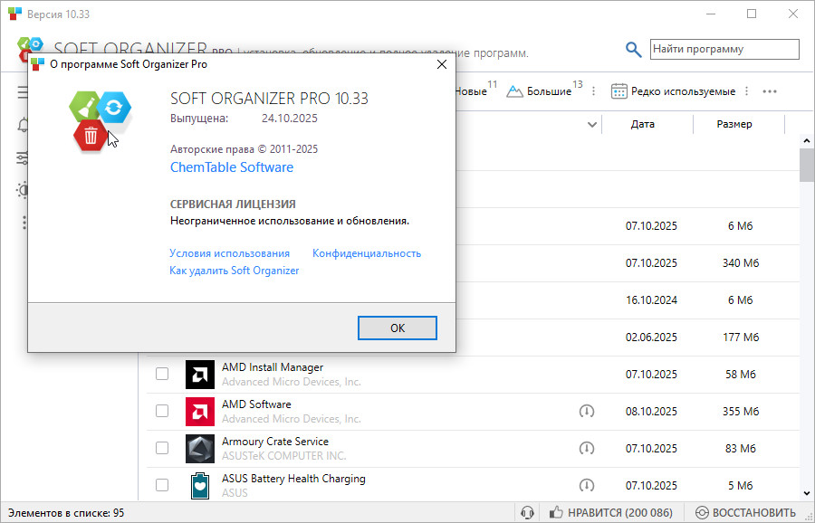 |  Soft Organizer пригодится Вам если Вы часто устанавливаете, и удаляете программы. Ведь стандартный деинсталлятор системы windows, до конца не стирает программы. После такого удаления, остается много мусора, который будет накапливается в реестре, на диске. Тем самым, замедляя работу компьютера, и отнимая у Вас место. В общем для себя я выбрал именно этот инструмент, как средство удаления программ. Он умеет стирать всё то, что когда-то требовалось для работы, того, или иного приложения. При этом, перед удалением, вы сможете посмотреть количество следов в реестре, и на диске. При чём есть возможность перейти к непосредственному месту их расположения. Допустим, Вас заинтересует определенная запись в реестре, так вот, Вы сможете перейти прямо в редактор реестра, и сделать с ней всё что угодно. Теперь о самом главном, а именно об активации Soft Organizer, ну здесь всё в порядке, лицензионный ключ так сказать прилагается. Поэтому можете быть спокойны, в специальном файле есть и инструкция об его использовании. Для тех пользователей которые установили этот инструмент не сразу после загрузки windows, есть приятная новость. Дело в том, что приложении позволяет искать следы раннее удаленных программ, не через него. Такой функции я лично не встречал ни в одно подобной программе. Для вашего удобства, все установленные приложения сортируются, на большие, новые, и часто удаляемые. В общем если хотите держать производительность компьютера на высоте, то обязательно рекомендую к установки данное средство. Размер: 15 Mb Язык: русский Лекарство: ключ Платформа: Windows Скачать: Soft Organizer 10.33 |