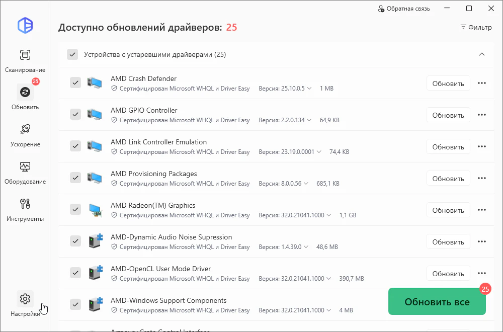 Не смотря на точность определения оборудования, я все же рекомендую перед обновлением драйверов создавать бэкап старых версий, благо данная возможность предусмотрена в программе. Многие пользователи пренебрегают этим советом, в результате чего при неудачном обновлении, получают ошибку с устройством, в общем лучше перестраховаться.