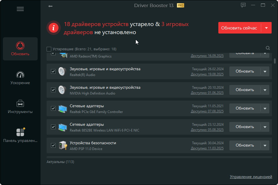Вы сможете обновить все драйвера как одним махом, так и каждый по отдельности. Более того, можно добавлять в исключение на обновление абсолютно любое устройство на компьютере. Кстати, в программе имеется инструмент под названием “Ускорение игр”, включив который программа на время игры отключит в системе не нужные для игр службы, тем самым освободит компьютерные ресурсы.
