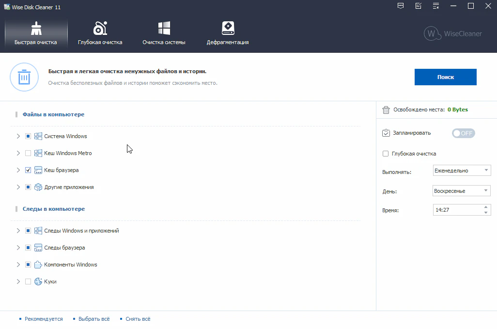 ![]() Многие пользователи даже и не подозревают, что периодически необходимо чистить диски компьютера от мусорных файлов, которые скапливаются в процессе вашей работы за компьютером. Но в один день, они понимают, что где-то пропало много места, особенно это касается системного диска "C". И только после этого многие задаются вопросом как почистить диск "C" от ненужных файлов? Для этой цели могу порекомендовать не большую программу Wise Disk Cleaner, её название говорит само за себя. Как только Вы её установите, то сразу же можно приступать к сканированию дисков на предмет мусора. Кстати перед этим можно выбрать в каких областях искать не нужные файлы. Рекомендую оставить данные настройки по умолчанию, и просто подождать пока приложение проведет сканирование, и обнаружит мусорные файлы. Затем просто нажатием одной кнопки Вы сможете избавиться от них, тем самым освободив занятое место. В Wise Disk Cleaner присутствует несколько методов очистки: быстрая, глубокая, и очистка системы. По мимо чистки дисков, в программе есть встроенный дефрагментатор, используя который можно дефрагментировать жесткие диски, тем самым ускорить их. Хочу обратить ваше внимание, что SSD накопители не нуждаются в дефрагментации, более того, для них это вредно. Эта программа не много модернизирована, из неё удалены реклама, и другие не нужные элементы, которые на наш взгляд являются лишними, оставлен только самый необходимый функционал. Год: 2026 Размер: 10 Mb Язык: русский Платформа: windows Скачать: Wise Disk Cleaner 11.3.4.854 |