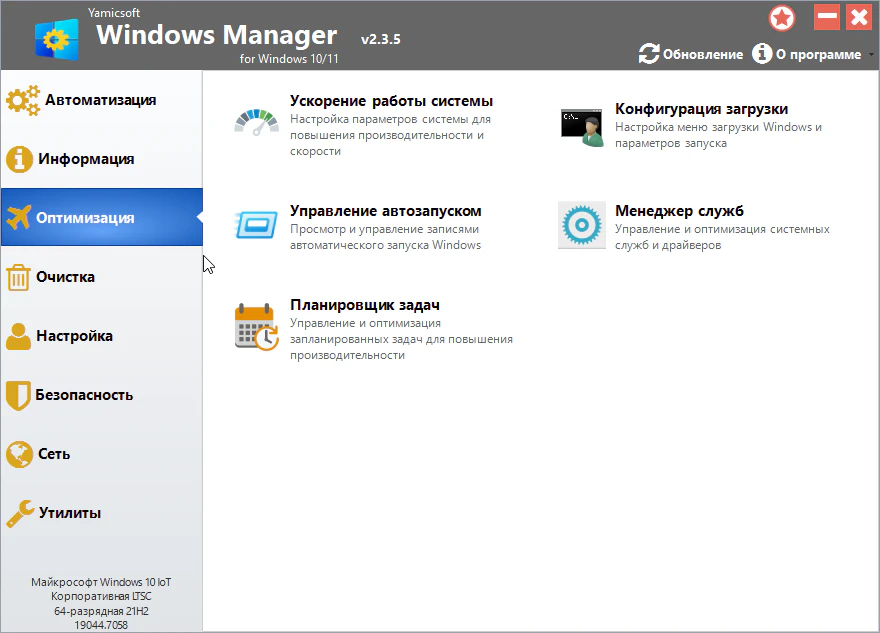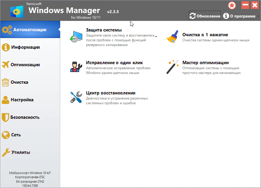 ![]() До недавнего времени, разработчики программы Windows Manager, выпускали для каждой версии Windows свою версию приложения. Но с недавних пор они решили сделать в одной версии, поддержку двух операционных систем, а именно версию 10 и 11. Далее расскажу для тех, кто не в курсе для чего нужна эта программа. После её установки вы сможете произвести очистку системы, при чем есть опция под названием "очистка в один клик". Используя её нажатием всего одной кнопки, можно очистить систему от временных файлов, не нужных записей в системном реестре. Все эти же действия можно сделать и в ручном режиме, кстати, что я и рекомендую делать. Так же есть возможность управлять автозапуском, имеется ввиду можно добавлять и удалять в меню автозагрузки программы, которые будут стартовать одновременно с Windows. Кроме этого можно управлять и службами системы, останавливать удалять, выставлять запуск с задержкой и так далее. Ещё программа умеет искать дубликаты файлов, удалять предустановленные программы Windows. В добавок доступна настройка контекстного меню, там вы сможете удалить не нужные элементы, ну или же на против добавить. По мимо этого, присутствует возможность визуальной настройки системы. К примеру, можно изменять стандартную иконку папок, менять им цвет, и делать ещё много чего подобного. Это далеко не весь перечень возможностей этой программы, но думаю вы и так уже поняли для чего она нужна. Активировать Windows Manager не нужно, регистрация происходит автоматически в ходе установки. Просто проинсталлируйте его, и можете сразу начинать им пользоваться. Размер: 11 Mb Активация: не требуется Платформа: Windows 11,10 Язык: русский Скачать: Windows Manager 2.3.5 |
