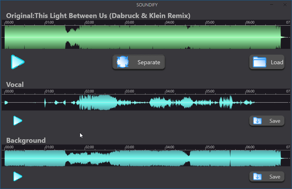 ![]() Сегодня неожиданно для себя нашёл интересную программу, и принял решение поделиться ею с вами, с моими пользователями, так как посчитал что она будет интересна вам. Такой или даже подобной программы на сайте я никогда не публиковал, так как до сегодняшнего дня просто не встречал. В общем представляю вам Soundify Vocal Remover, приложение, которое станет полезным для музыкантов и простых пользователей далеких от музыкального творчества. Используя эту программу, можно удалить вокал из любого музыкального трека. Таким образом вы сможете без особого труда создавать свои собственные караоке, а потом петь в месте со своими родными, или друзьями у себя дома. Не имеет значение на русском или английском поют в песне, приложение без труда удалит слова. Думаю и на других языках она способна удалять вокал, но я не проверял, так как не было под рукой таких музыкальных композиций. Что бы удалить вокал из трека, нужно запустить программу, добавить в неё интересующую вас композицию, после нажать кнопку для удаления слов, и подождать пока идет процесс. После того как он закончится, перед вами будет три версии вашего трека. Первая версия это оригинал, вторая это вытянутый вокал с трека, то есть отдельно от музыки слова, который кстати говоря можно сохранить. Ну и третий вариант это кончено же это трек без слов, чисто музыка, естественно его так же можно сохранить отдельно. Как видите работать с приложением совсем просто, с ним справится даже начинающий пользователь. Я, кстати говоря, был приятно удивлен на сколько хорошо, и быстро программа справляется со своими заявленными возможностями. На сегодняшний день приложение поддерживает обработку таких форматов как: MP3, WAV, и кончено FLAC. Вопрос с активацией Soundify Vocal Remover уже решен, один добрейший человек встроил её в программу, таким образом получилась полностью активированная версия, с разблокированным функционалом. Размер: 173 Mb Активация: есть Язык: русский Платформа: Windows x64 Скачать: Soundify Vocal Remover 1.2.7 |