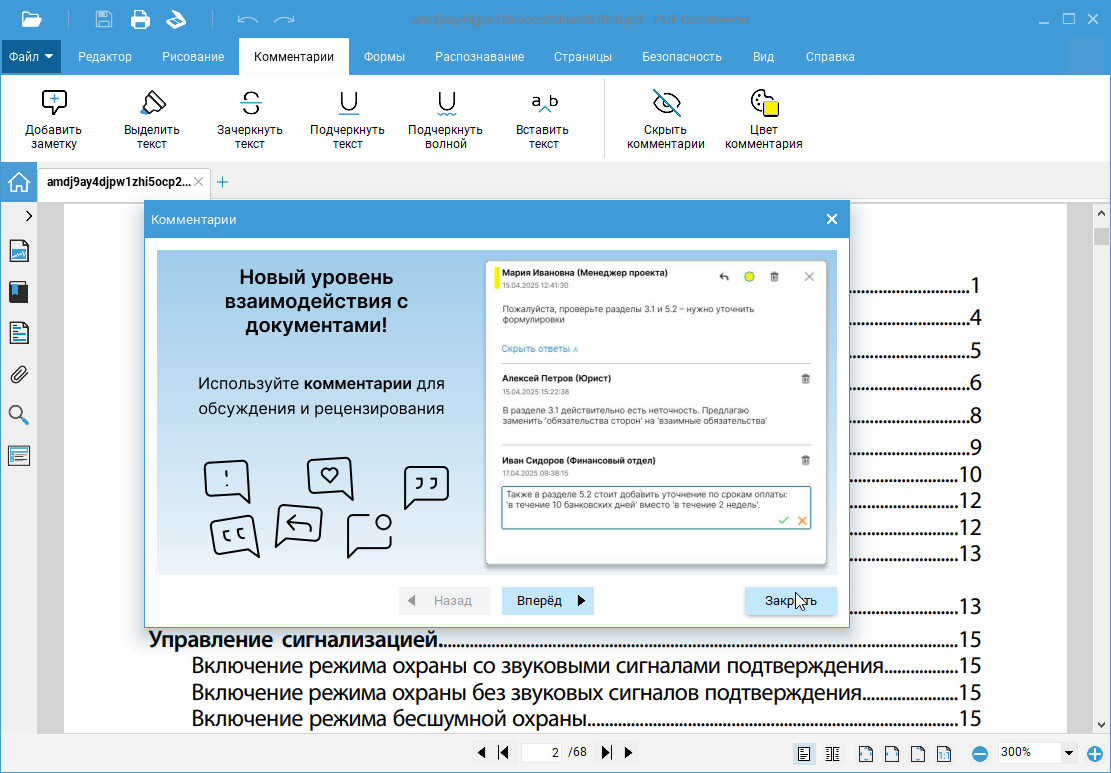 ![]() Ну что вот и пришёл тот день, когда на сайте я выложил PDF Commander, признаться честно давно хотел это сделать, но все никак не получалось. Несмотря на то, что на сайте и так полно программ для работы с PDF, я все равно решил добавить ещё одну, так как в курсе что они среди вас популярны. В общем для тех, кто не в курсе упомянутая программа позволяет вам просматривать любые документы PDF. Конечно, у вас может возникнуть вопрос для чего она если на сегодняшний день любой браузер позволяет открывать данный формат? Ответ прост кроме открытия она позволяет и вносить в документы PDF изменения, другими словами, редактировать их. Что бы внести изменение в нужном месте в вашем документе, необходимо его открыть в программе, и нажать на кнопку "Редактировать", после чего приложение перейдет в режим редактора. Ну а далее вы сможете изменять текст в документе, подчеркивать и выделять его. Кроме этого, сможете без проблем добавить имеющееся изображение непосредственно в редактируемый документ. Кстати, программа позволяет ставить и так называемые штампы, при чем его можно поставить как на отдельно взятой страницы, так и на всех сразу. Конечно же в приложение имеются и сами штампы. Если их окажется вам мало, то сможете загрузить и свои, конечно при их наличии у вас. Ещё хотел бы обратить внимание на то, что программа позволяет добавлять комментарии на любой из страниц документа. Кстати, так же стоит отметить, что вы сможете создавать PDF документы так сказать с нуля, при этом источником информации могут служит изображения и другие текстовые документы. Конечно же приложение умеет конвертировать PDF файлы в другие популярные на сегодняшний день форматы документов, к примеру в Word. Ну и на последок добавлю что программа естественно позволяет подписывать документы. Теперь думаю стоит сказать несколько слов об активации PDF Commander, естественно мы позаботились о ней и добавили рабочий ключ, но он идет не в привычном для вас виде. Он выполнен в виде нескольких файлов по причине того, что цифровой найти просто не реально. Что бы выполнить активацию программы, необходимо произвести некоторые действия, сложного ничего нет. Просто потребуется скопировать несколько файлов в папку с программой, все подробно расписано в прилагающейся инструкции, главное читайте внимательно и делайте как написано. Размер: 206 Mb Язык: русский Платформа: Windows 7/8/10/11 Активация: присутствует кряк Скачать: PDF Commander 14.0 Профи с ключом |