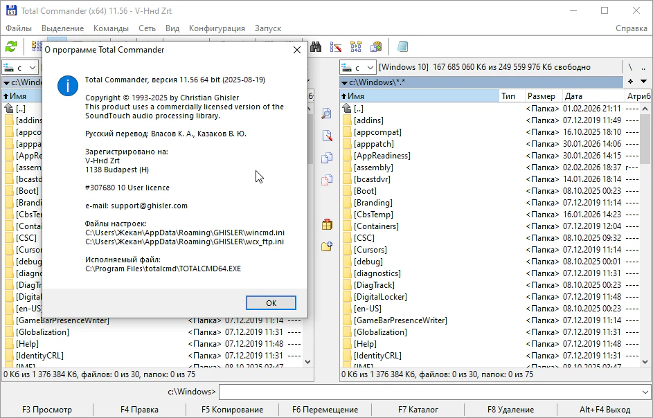 Процесс регистрации довольно прост, после установки необходимо скопировать файл ключ в то место где установлен Total Commander. После этого его можно запускать и пользоваться без ограничений.