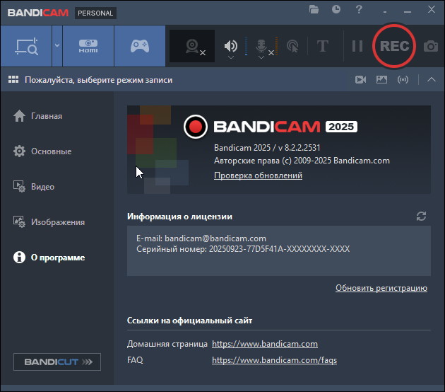 Для того что бы зарегистрировать Bandicam, необходимо ввести серийный номер, к сожалению в открытом доступе его просто нет. Однако есть специальный патч имитирующий его ввод, после применения которого, программа становится зарегистрированной. Он находится в папочке с самим приложением, там же есть необходимые инструкции по его применению.